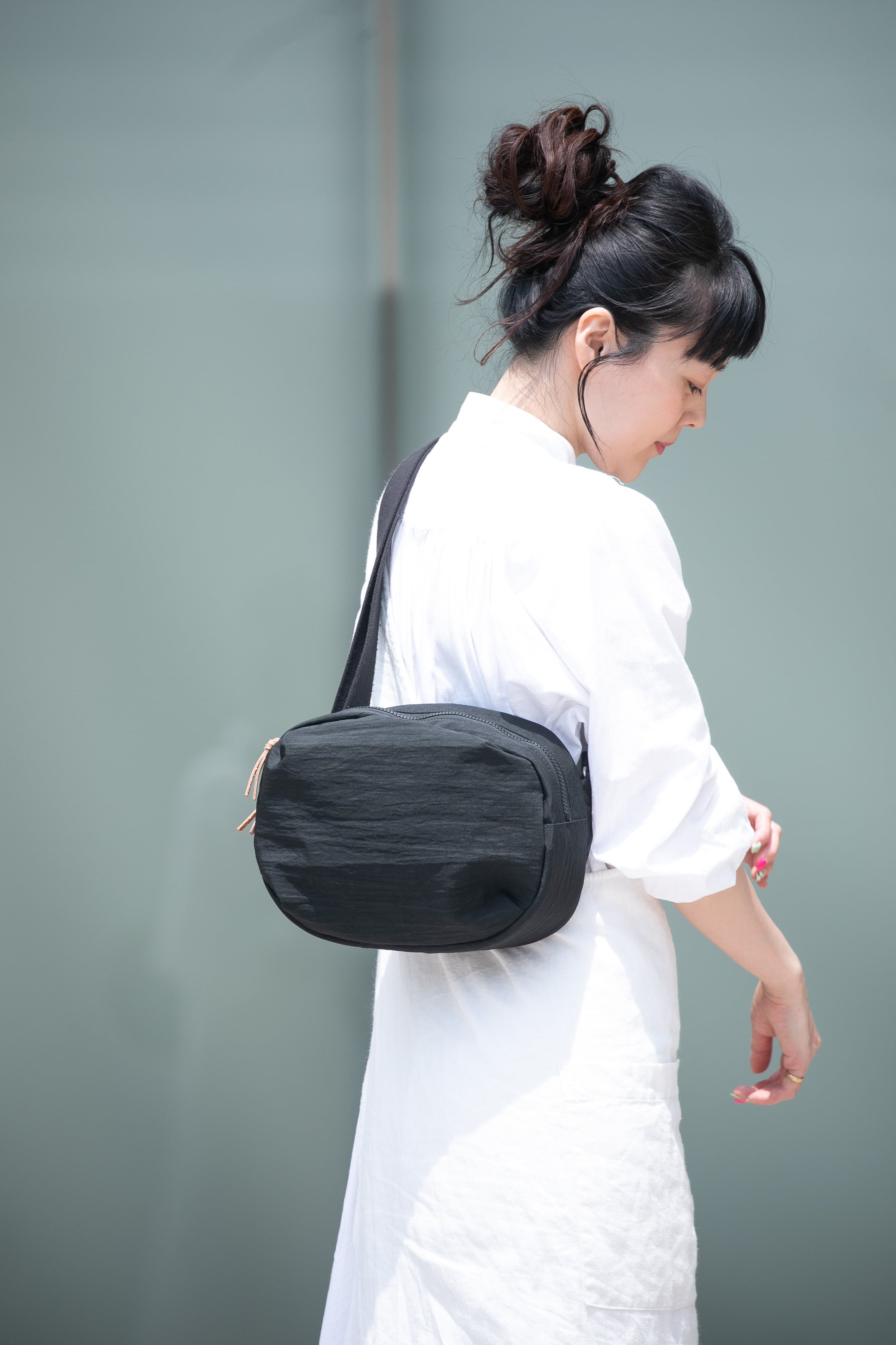 福井県産の国産ナイロンに塩縮加工と 撥水加工を施したボディバッグ。生地の風合いが活きるよう、デザインは極力シンプルにしています。
